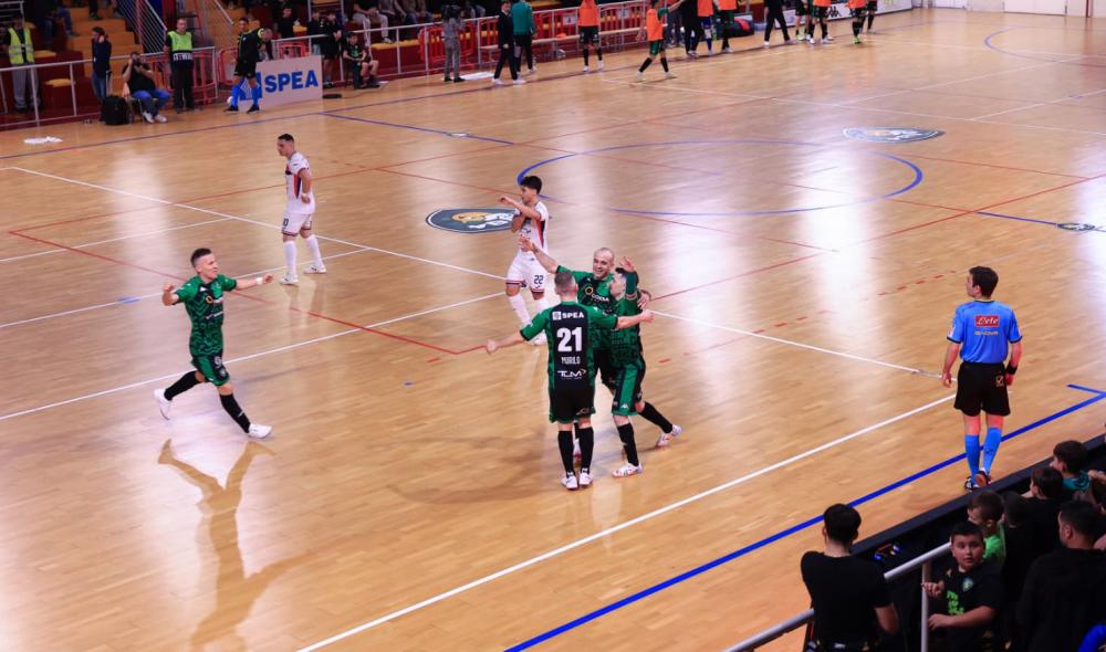 DAY 26 - Nello Sky Match avvio da incubo delle Volpi di Antonelli che capitolano già dopo 1' sul mancino di Schiochet. I neroverdi continuano a spingere e prima dell'intervallo colpiscono ancora con Cuzzolino, Rescia e Fortini. Selucio e Lemos accorciano ma Cuzzolino ferma la rimonta prima del punto esclamativo messo da Liberti (2) e De Oliveira: neroverdi a pari punti con la Meta Catania, impegnata domani a Pomezia. Turno favorevole anche alla Roma 1927 che non cade in Puglia (Ricardinho e Avellino regolano il Global Work Capurso), alla Came Treviso (al terzo successo di fila) che fa suo lo scontro salvezza con il Saviatesta Mantova portandosi momentaneamente a +4 sulla zona play-out e, infine, allo Sporting Sala Consilina: Arillo, Vidal e la coppia Rossetti-Igor (freschi di rinnovo) decidono il derby con la Sandro Abate.
