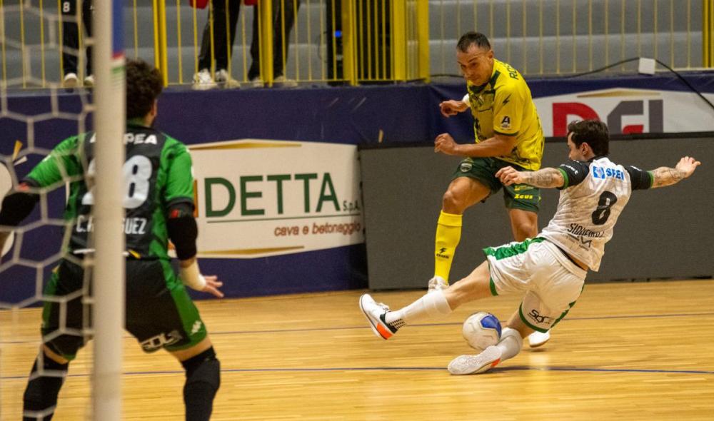 PRIMO TEMPO - L’AeS sfiora il vantaggio dopo 2’: Murilo serve Gui davanti l’area, ma la conclusione del Toro sfiora il palo. Murilo, a 3’45”, perde un pallone velenoso recuperato da Patias, che costringe Ricordi a una bellissima parata in tuffo. A 4’43”, la Feldi passa in vantaggio: Dani Chino anticipa Coco e sorprende l’estremo difensore avversario, che può solo toccare il pallone. Il team abruzzese, però, pareggia immediatamente: il numero 10 dell’AeS si fa perdonare con un assist d’oro a Lukaian sul secondo palo, che deve soltanto spingere in rete. Il match si infiamma, con capovolgimenti di fronte continui. Romano, a 8’50”, va vicino al nuovo vantaggio, ma Ricordi è bravo a murare il suo tentativo da due passi. È Gui, a 9’15”, a mettere alla prova Dal Cin, che si distende e allontana la sfera. La sfida si mantiene su ritmi sostenuti. Canabarro, a 15’16”, mira l’angolino dalla distanza, ma la conclusione non trova lo specchio. Dal Cin, a 25” dall’intervallo, è bravo a rimanere in piedi e a respingere il pallonetto di Calderolli; il 9 dell’AeS, in seconda battuta, tenta l’eurogol in rovesciata, ma la sfera viene facilmente murata dalla difesa della Feldi. Le squadre, quindi, rientrano negli spogliatoi in perfetto equilibrio.